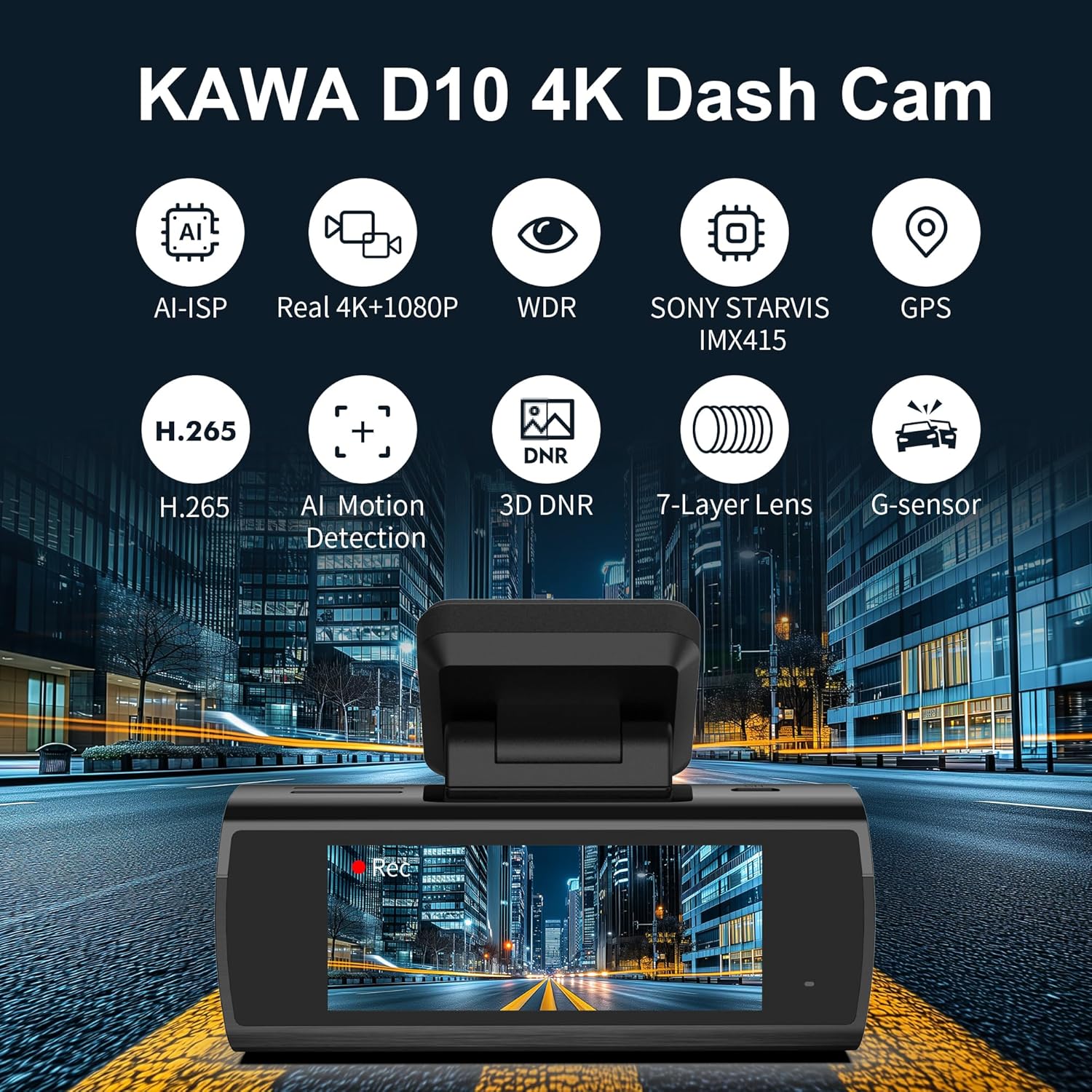 KAWA Car Dashcam Front and Rear 4K Night Vision AI-ISP Real Colours Dash Camera WiFi 4K+1080P, 64G SD Included, with GPS & WiFi, Recording Loop, 24H Parking Mode, D10